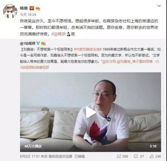 同为首届新概念作文大赛一等奖的获得者,格子里的夜晚生前好友韩寒,听闻消息后也惊诧良久。