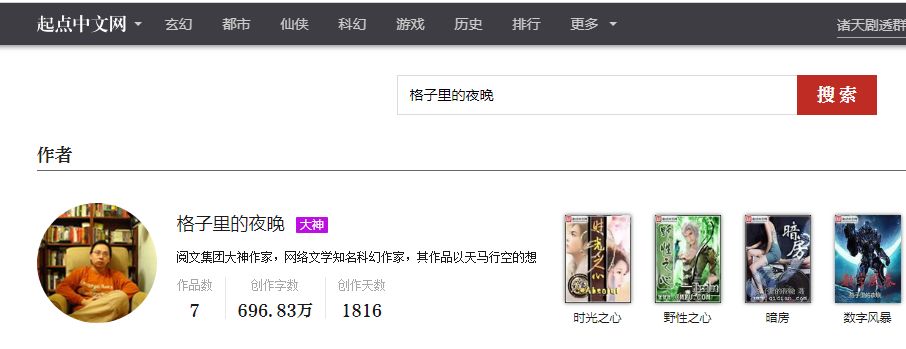 2004年起,他开始在起点中文网发表作品,完成《数字生命》、《时光之心》、《完本之王》等佳作的同时,也不知不觉间步入了中年。