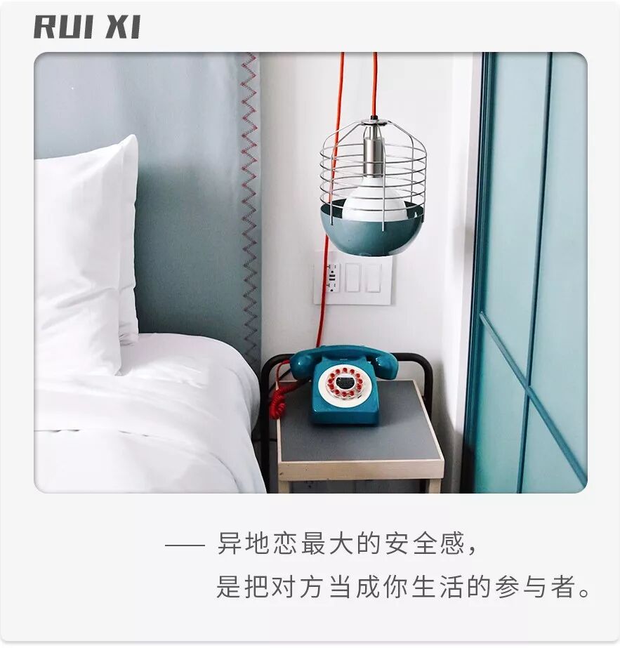 异地恋最大的安全感就是让对方觉得他是你生活的参与者,而不是局外人。这种安全感,是从主动跟对方分享自己的生活中产生的,是需要双方互相努力给予的。