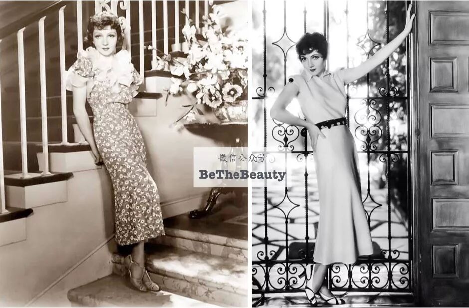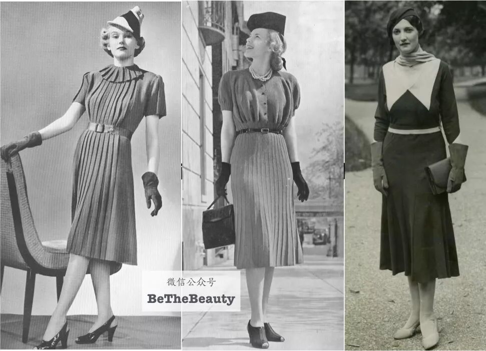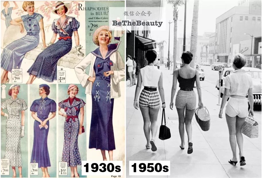 ▲30s大萧条时期,裙摆几乎到脚踝。50s战后黄金发展时期,短裙和露肤大面积流行