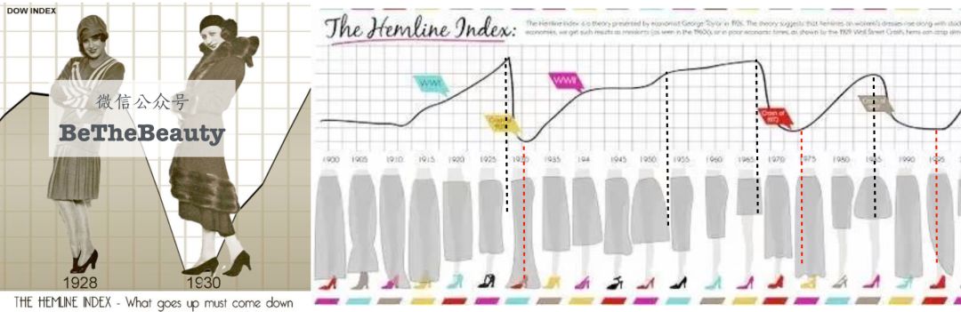 ▲右边的图中,我标出了经济高起(黑线)和低落(红线)时期,可发现跟裙摆长度变化相映成趣