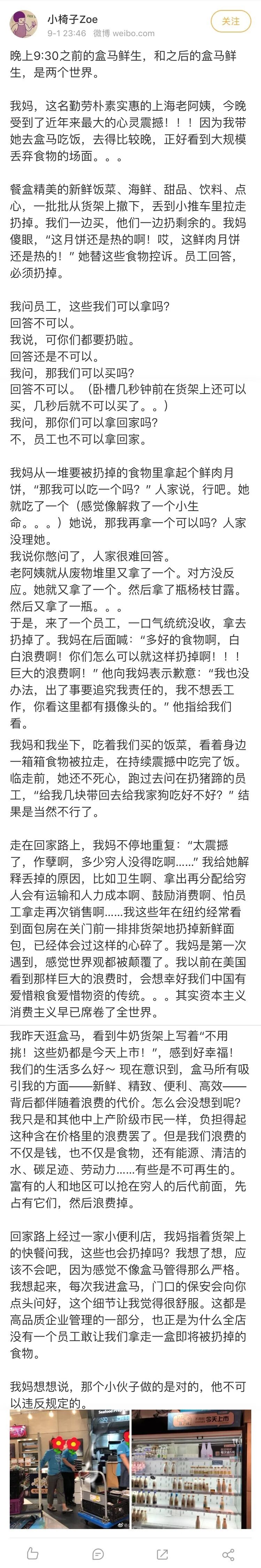 一个ID是小椅子zoe的博主发了一条关于盒马鲜生(有好一段时间我都叫成盒马生鲜……)的长微博,内容如下,不复杂,你们可以自己先看。