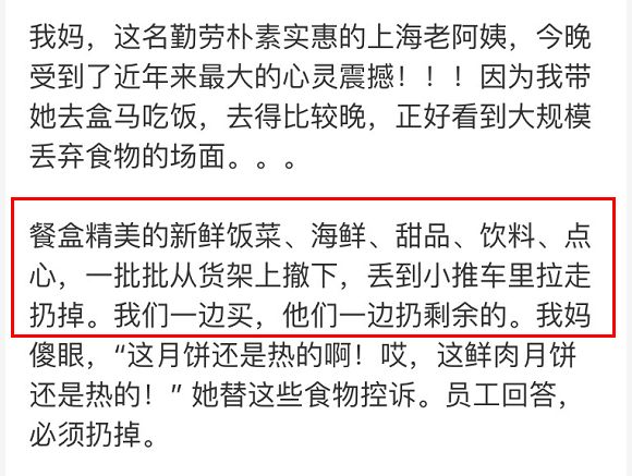 于是博主和妈妈就开始感叹,盒马的新鲜和便利背后的代价是无法想象的,虽然知道这是必然的,但眼睁睁看着好好的食物就这么被扔掉,还是有本能的抗拒感。