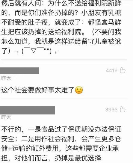 像盒马鲜生这样,规定当天没有卖完的东西必须处理掉,这部分费用肯定在他们的可控范围内,他们扔得起,但不代表“扔掉新鲜东西”的行为就不是浪费。