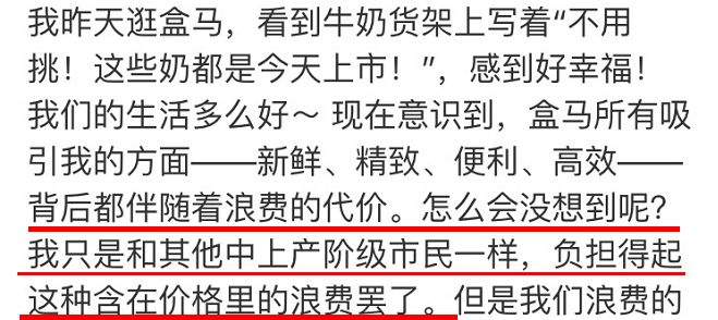 她对社会学经济学可能也都只是稍微了解一下,并没有深入,可也没有居高临下地谴责盒马作为企业不顾环保和民生。整体看起来,就是我们很多普通路人会有的反应一样,纯粹表达一下对享用生鲜必然伴随浪费食物的心痛和无奈感。