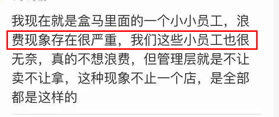 盒马的员工现身说法表示,确实浪费现象严重,但公司就是这样规定,普通职员确实没有办法破坏。