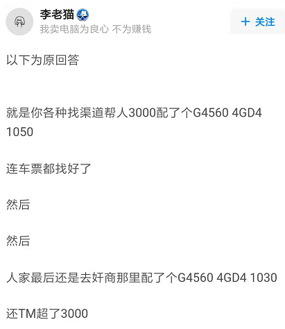 加上电脑硬件市场鱼龙混杂,不管是电脑城被坑还是熟人杀熟这一类事层出不穷,几千块钱不留神就打水漂,搁谁也不乐意。