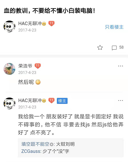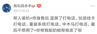 小白如此胡闹,引无数英雄竞折腰。因此大佬们纷纷感叹道:以后谁再找我装电脑,一律品牌机伺候。