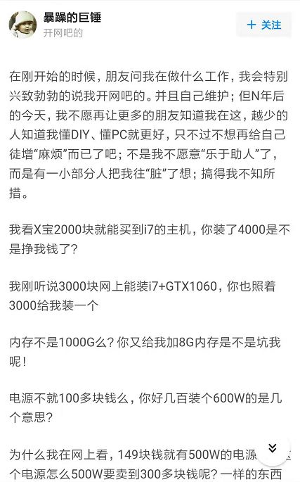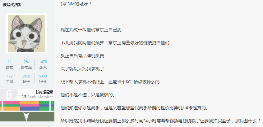 对于你的朋友来说,义务帮你装机往往是出于对硬件的热爱,以及不愿意看到自己的朋友被所谓的“淘宝整机”给套路,也许他已经在论坛上得到一个“楼主心真大,敢给小白装电脑”的评价。