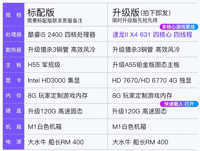 淘宝卖家往往会利用信息差,在配置表上做文章,就如同下图一样,强行把性能更强的i5 2400给反向升级成了性能上弱很多的速龙631。