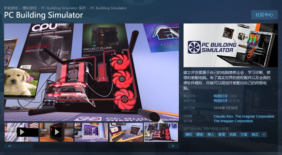 如果你想要上手实操却又没有电脑可以让你祸祸的时候,你甚至可以去Steam上找到这款《装机模拟器》(《PC Building Simulator》),在这里你不仅可以自己动手组装一台电脑,还可以成为“奸商”去坑骗其他的小白。