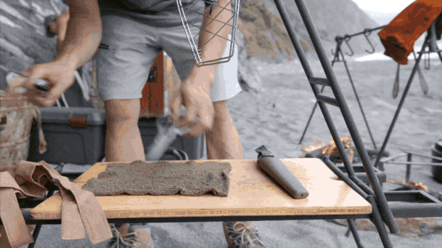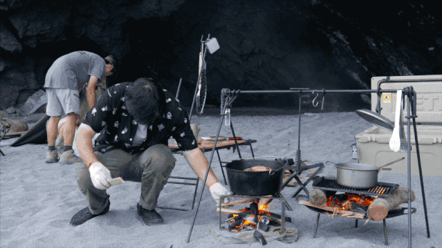 找好地点后,就开始扎营,生柴火,我们会在现场就地取材,捡一些石头,堆起来可以放烤肉架和烤网,就可以开始料理,烤肉的木材是自己带的龙眼木,这样肉烤起来有烟熏的香味。