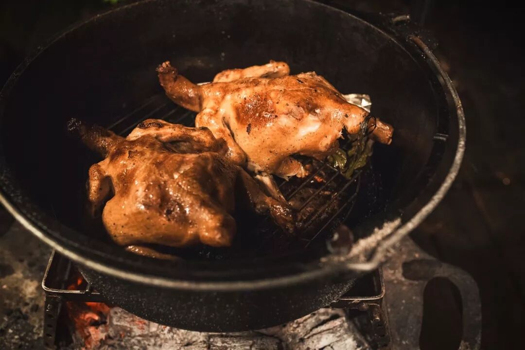 制作时先升火,将荷兰锅放上去预热,加一点水,把鸡放进去,上盖,烤一段时间,开盖让水蒸气蒸发后,再上盖,约40分钟或1小时(依照火力大小不同调整),开盖,表面脆皮即可食用。