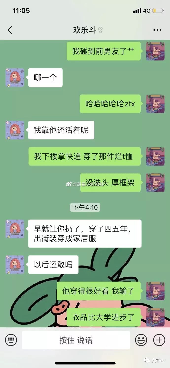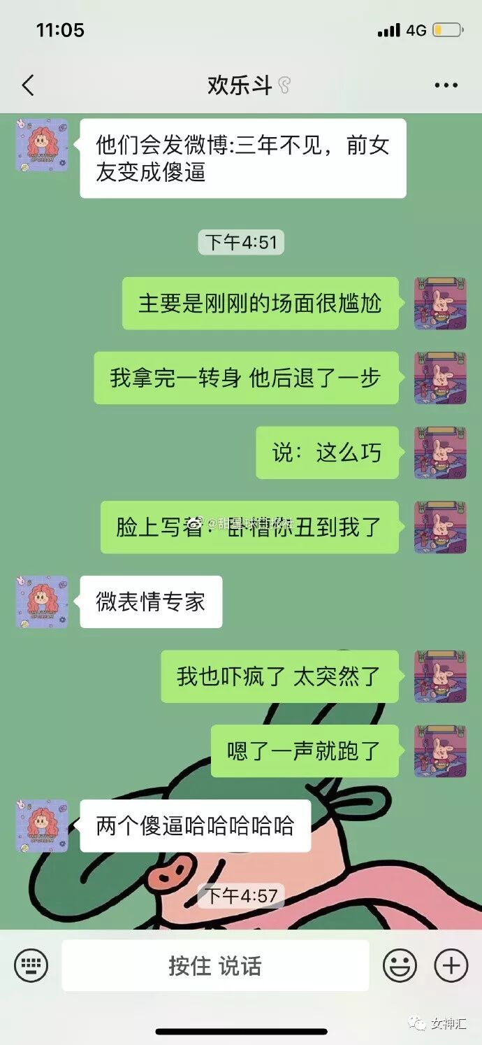 - 现在最尴尬和丢脸的事情 莫过于素颜遇到情敌 或者前男友吧! 网友投稿自己素颜竟然 偶遇多年不见的前任, 接下来发生的剧情 真是出乎我的意料! ▼ via:甜星球日报社 女生和闺蜜的聊天记录 哈