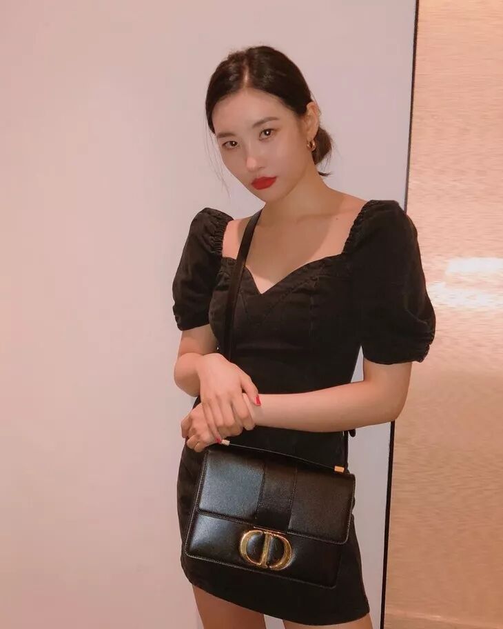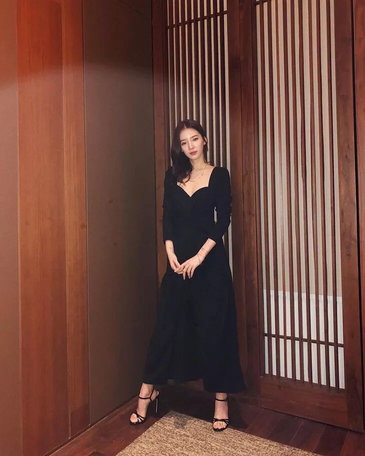 不想大面积露肤的女孩们可以选择宣美上身的这种领口开得比较高的款式,只露出好看的锁骨也能撩人于无形。