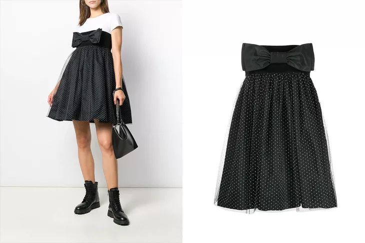 Irene Kim这件一字肩裹胸裙很好地展现了“微乳女孩”独有的美,腰部的几何线条从视觉上巧妙地收紧了腰腹部,具有空气感的袖子和大大的裙摆更能为“微乳女孩”的轻盈体态加分。