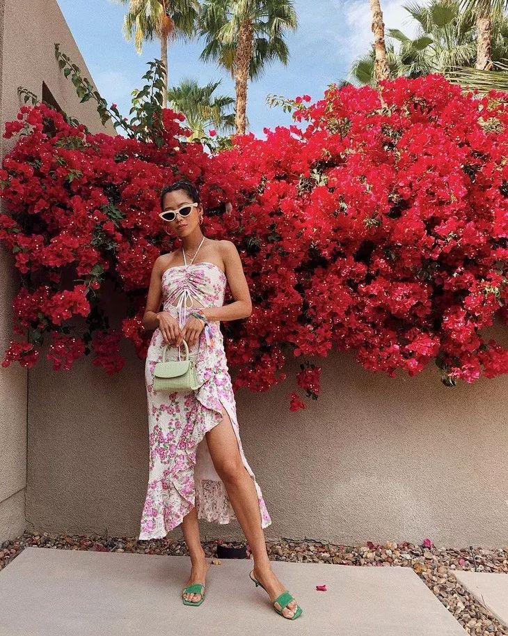 Kaia也穿过一条抽褶设计的裹胸裙,不过她选择的是可以露出纤细手臂的背心裙款式。原本酷酷的她,穿上白色碎花裹胸裙立刻“软”下来不少,整个人呈现出“甜而不腻”的氛围感~
