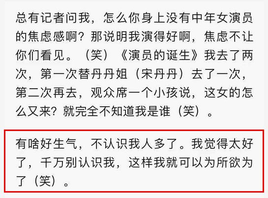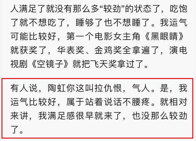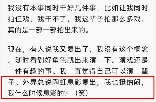 提到中年女演员的危机,陶虹认为确实有,但这种危机不全是圈内的,而是社会性的,因为社会本身就不关注,文学作品不会描写,没有剧本,才没有角色可提供,这是一整套连锁反应。