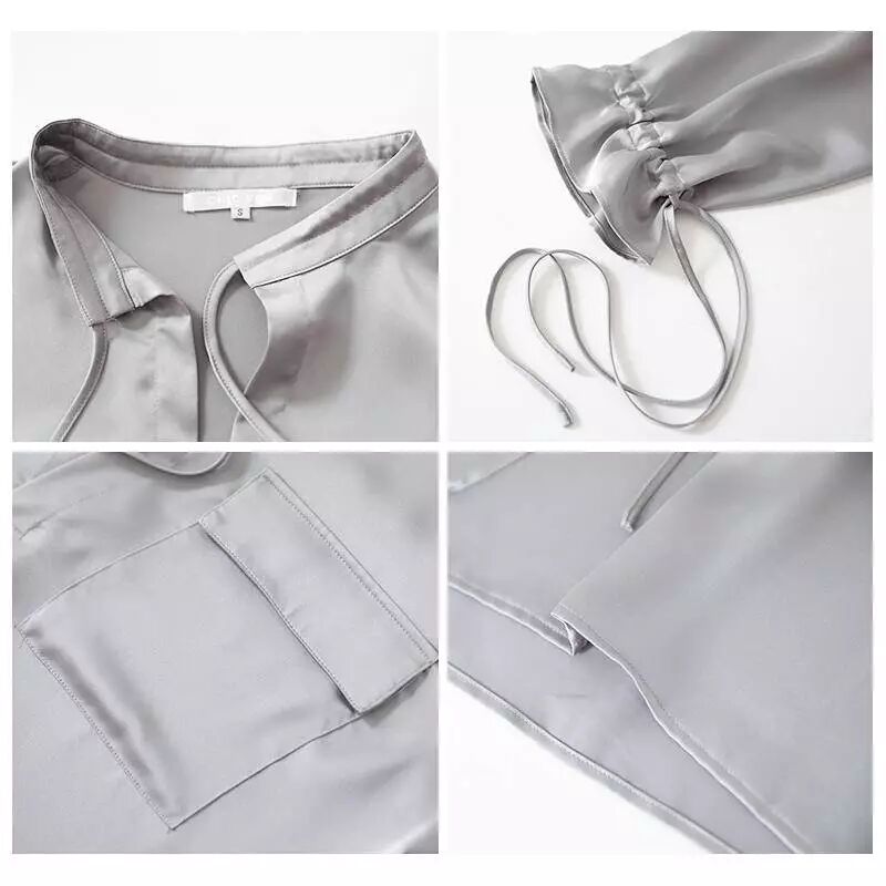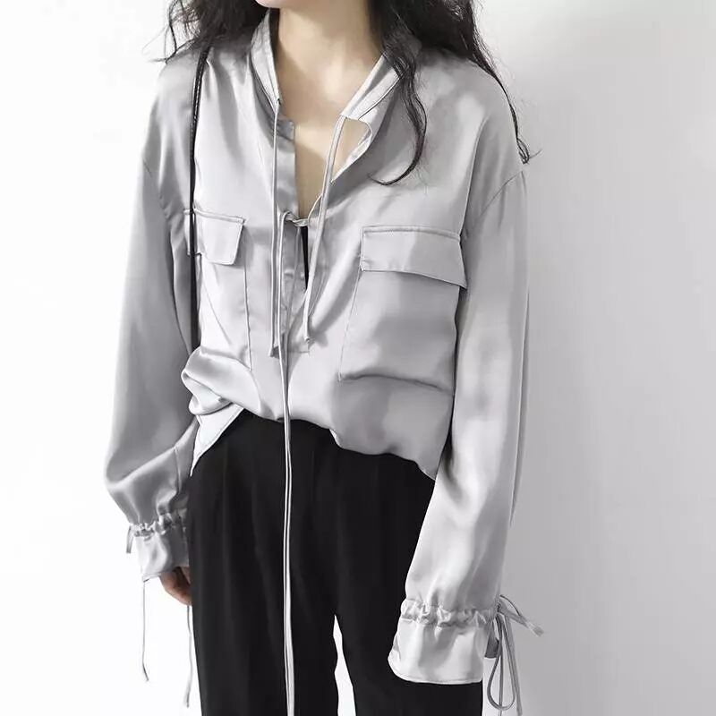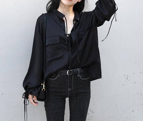 和普通衬衫不同的是这件是个大V领的设计,不走光全靠胸前的那个系带,有点小性感还能修饰脸型。