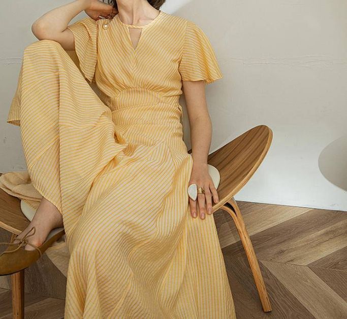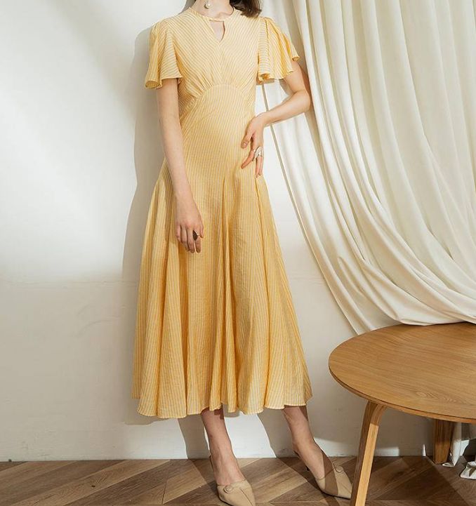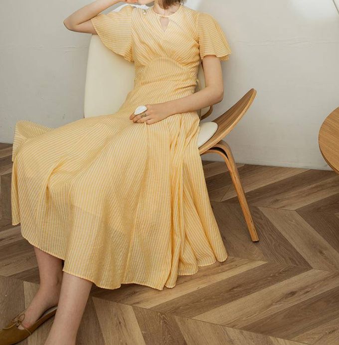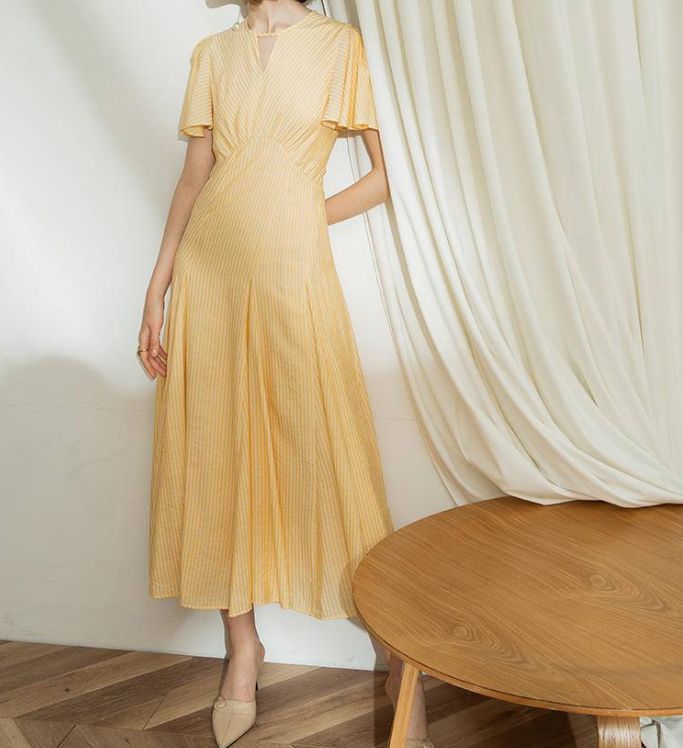 粉色蓝色我暂时没找到好看的,但是我找到了这条不显黑的鹅黄色条纹连衣裙~
