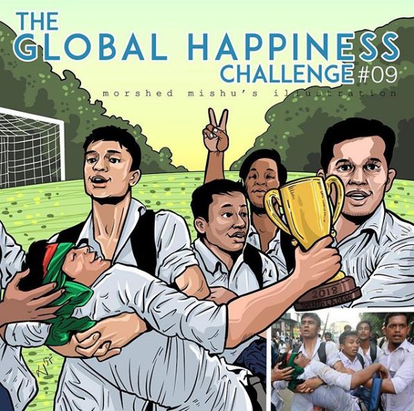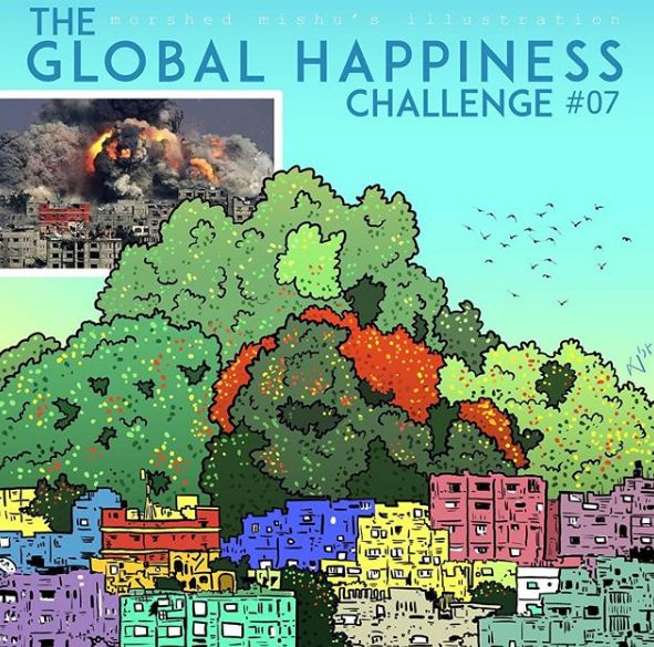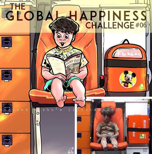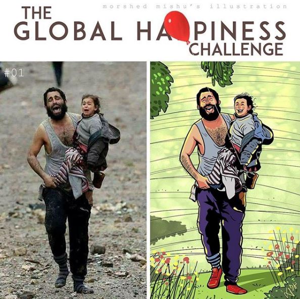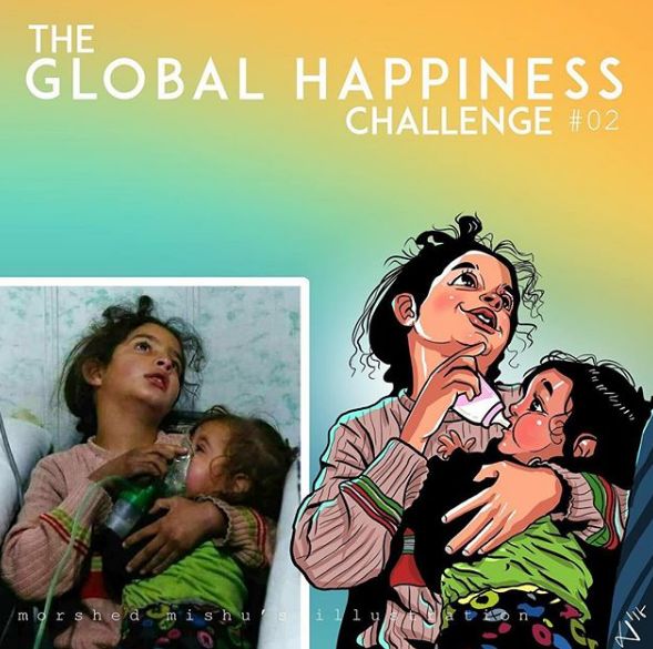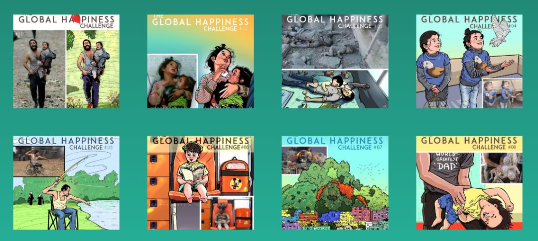 他的作品传播开后,人们把这系列漫画称为“全球幸福挑战”项目,越来越多人开始关注起这些失去至亲和家园的人。