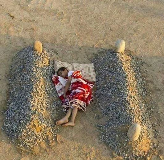 照片中的孩子在爆炸中被建筑埋住