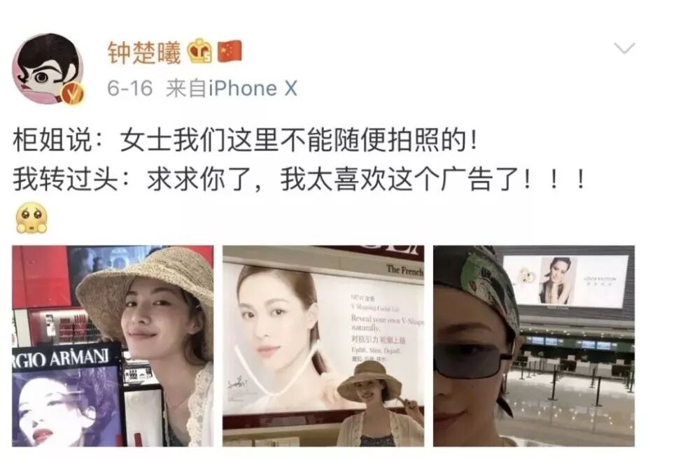 她自己也曾兴奋的在微博发文,表明自己在机场中遇到了自己代言的三支广告。