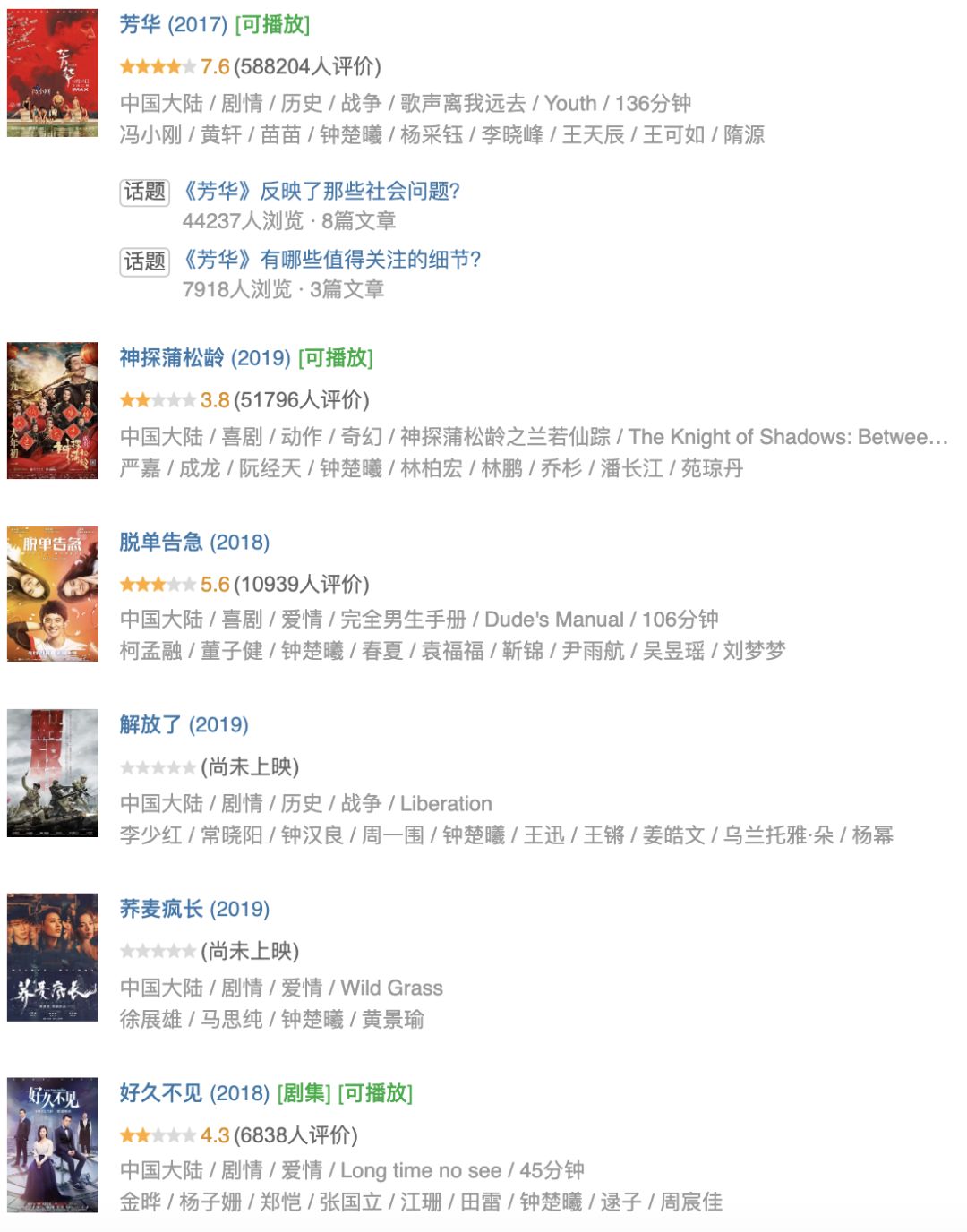 2017年《芳华》上映,这是钟楚曦人生中最大的一次机遇,似乎和自己的人生目标——章子怡也有了命运上的呼应。