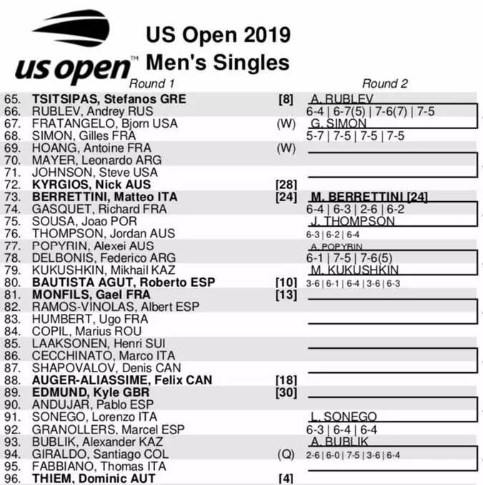蒂姆:温网,一轮游;美网,一轮游。西西帕斯:温网,一轮游;美网,一轮游。