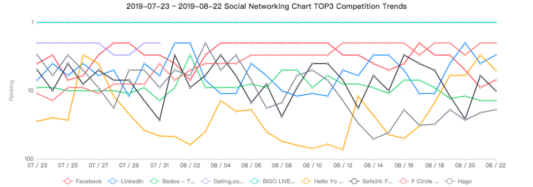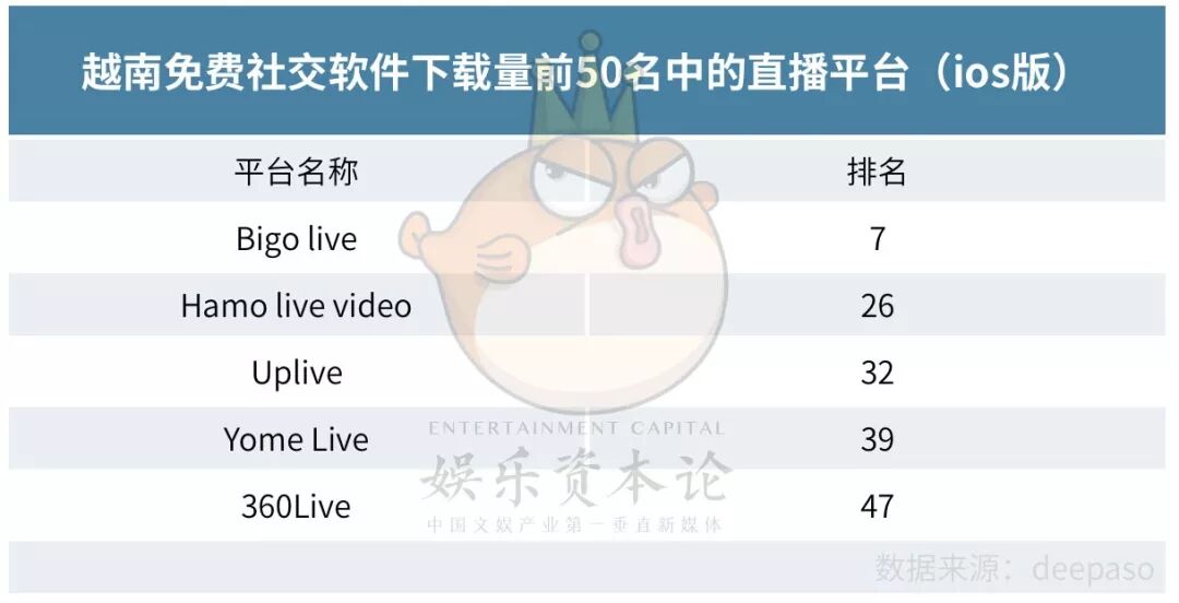 不仅国内影视文化内容在越南拥有较大的发展前景,越南用户对国内社交平台的欢迎程度也很高。据数据平台Deepaso显示近一个月以来越南ios版社交软件的下载排行中,Bigo始终保持在第一位。