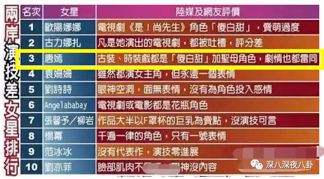 现在唐嫣的风评已经不太好了,千篇一律的角色、盲人式呆滞演技,让她一直盘旋在烂剧女星排行榜top3,