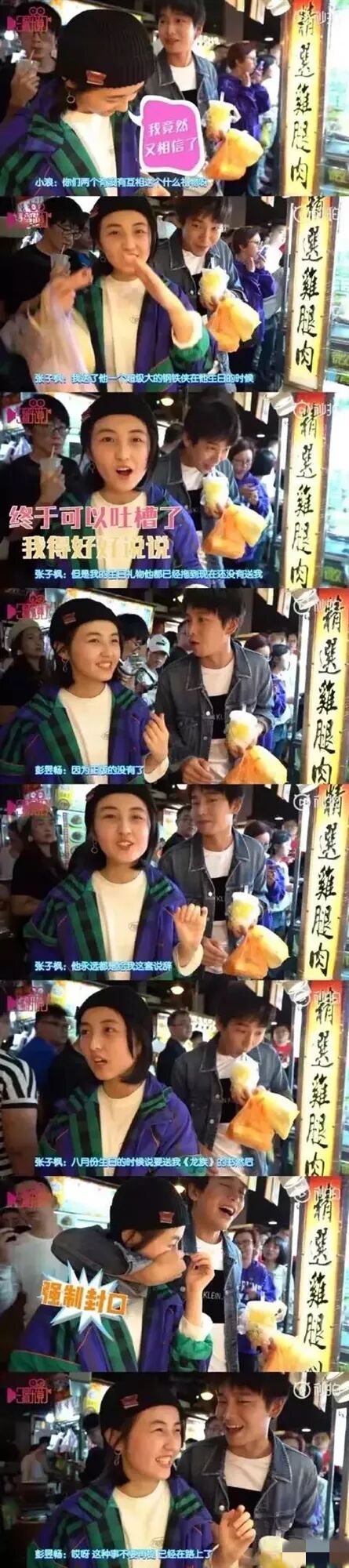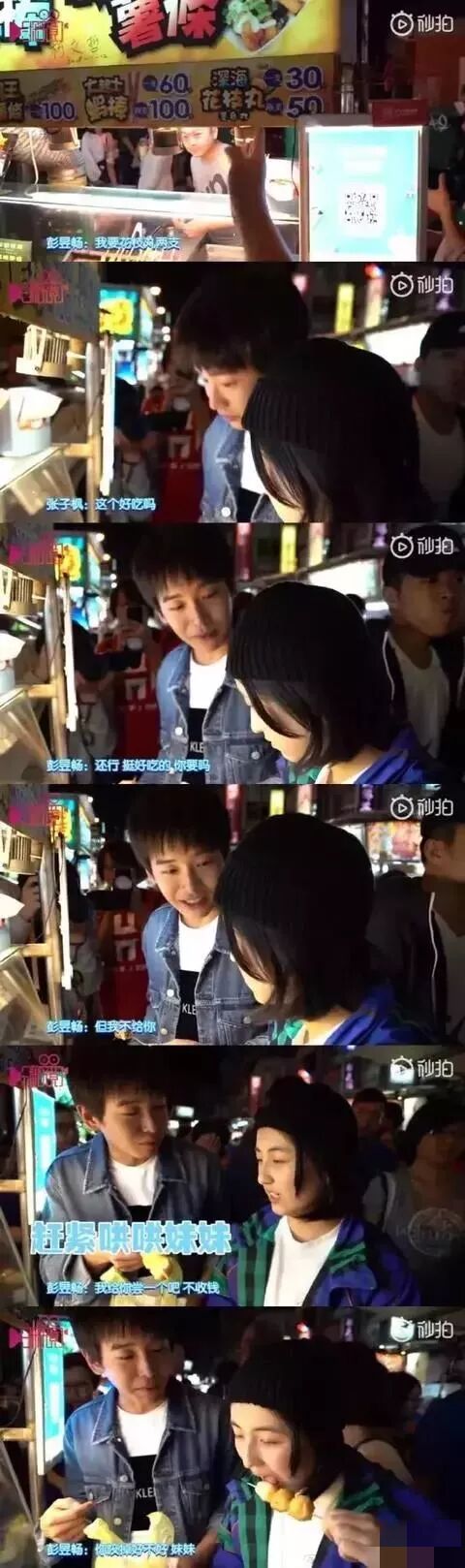 后来彭彭买了两支花枝丸,妹妹张子枫问好不好吃,彭彭逗妹妹说:“挺好吃的,你要吗?但我不给你”,虽然嘴上这么说,彭彭还是很快把花枝丸递到妹妹嘴边。