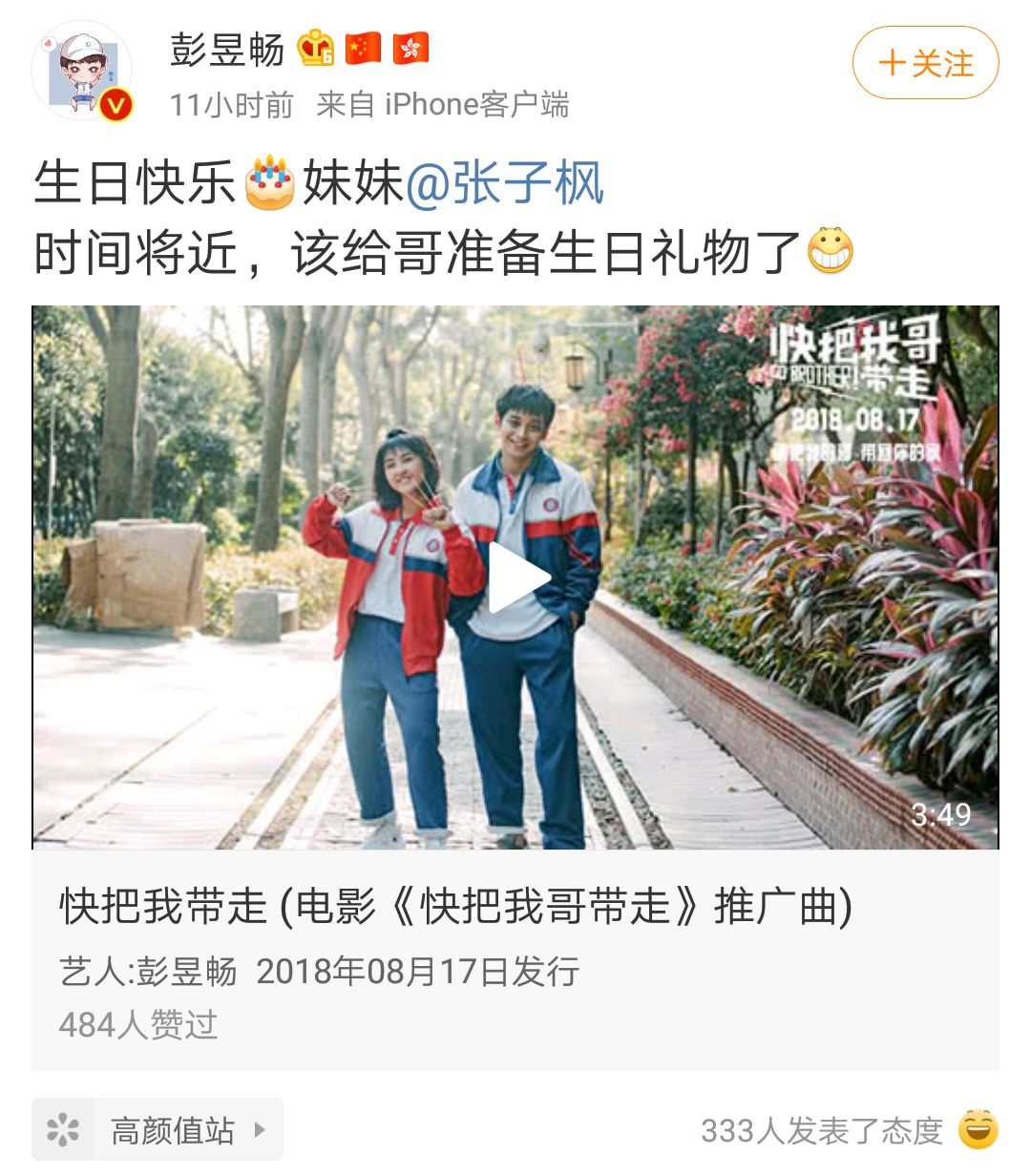 - 8月27日是张子枫18岁的生日,零点刚过,哥哥彭昱畅就在微博发文为妹妹庆生:“生日快乐妹妹,时间将近,该给哥准备生日礼物了。”还配上了电影《快把我哥带走》的主题曲。 对于哥哥庆祝生日还不忘给自己索要