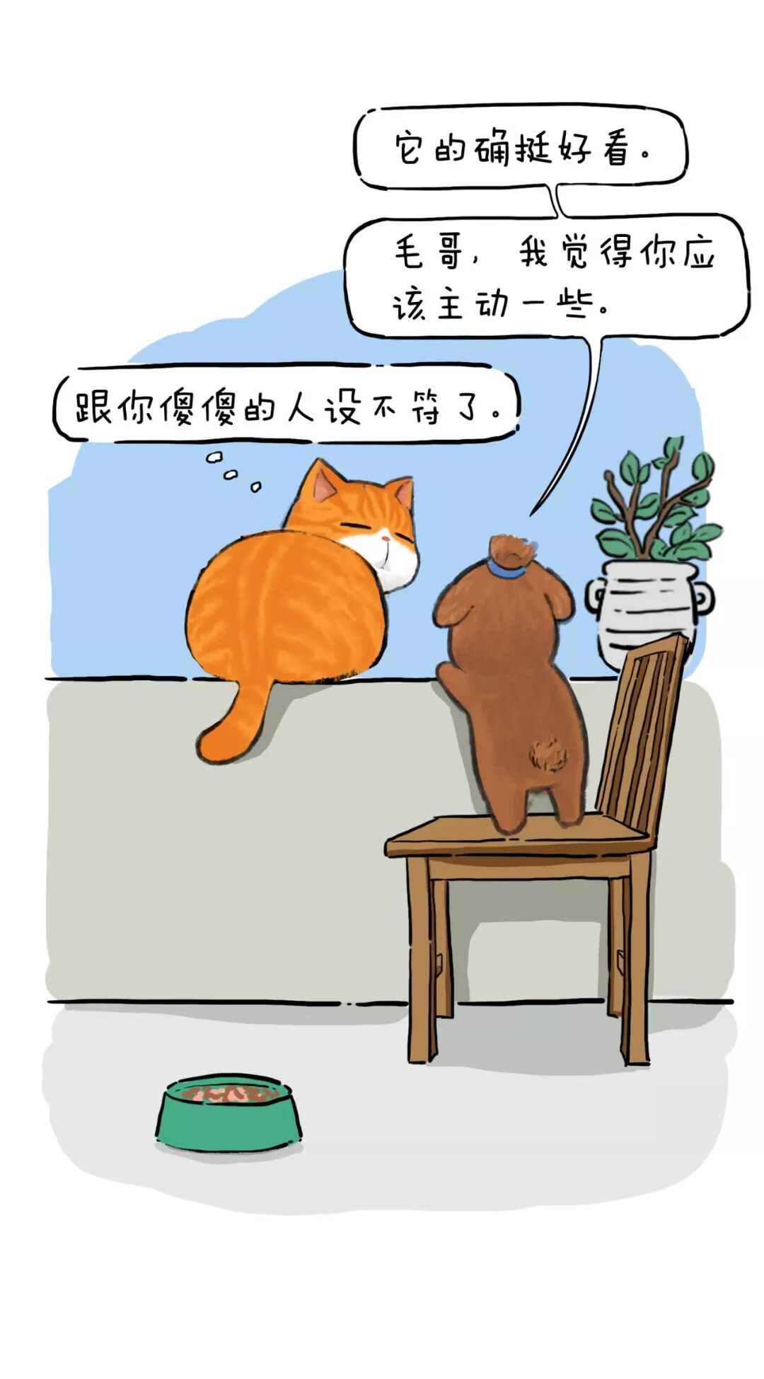 毛 毛:一只肥胖的橘猫,自认为是家里的老大,自称毛哥。整天眯缝着眼睛,说一些貌似很有道理的歪理。虽然很高冷,但有好吃的可以瞬间卖萌。