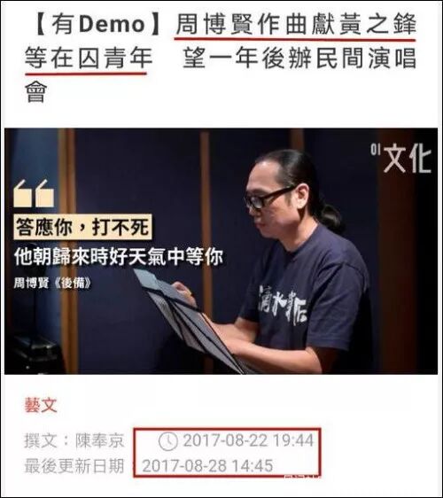 更大的猛料是,在黄之峰等人因为“占中”而入狱后,周柏豪于2017年又曾经唱了一首专门写给这些狱中青年的歌曲《有志青年》。该歌曲的作曲人周博贤直接点明,自己创作这首作品就是为了给这些80后鸣不平的,并认为他们不是暴力分子,而是螳臂当车的诉求者。