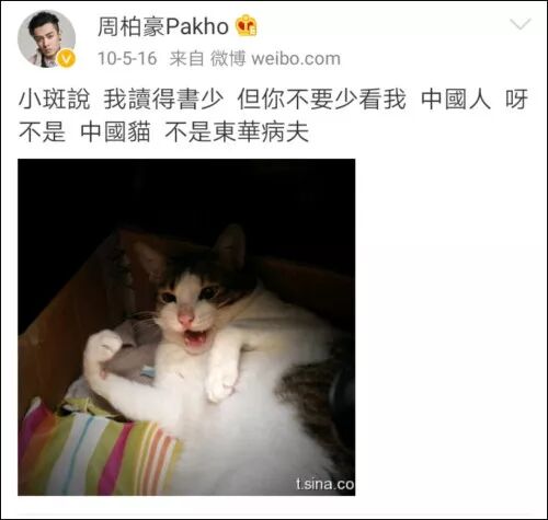 更早之前,在2010年时他曾在微博上假借自己爱猫“小斑”的口吻发文称,“我读得(的)书少,但你不要少(小)看我,中国人,呀,不是,中国猫,不是东华病夫。”