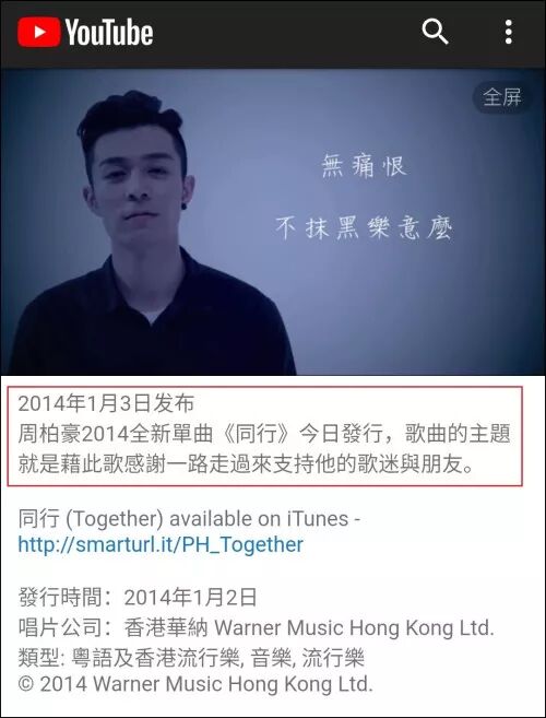 而在youtube平台上,有一首周柏豪在5年前发布的单曲《同行》。