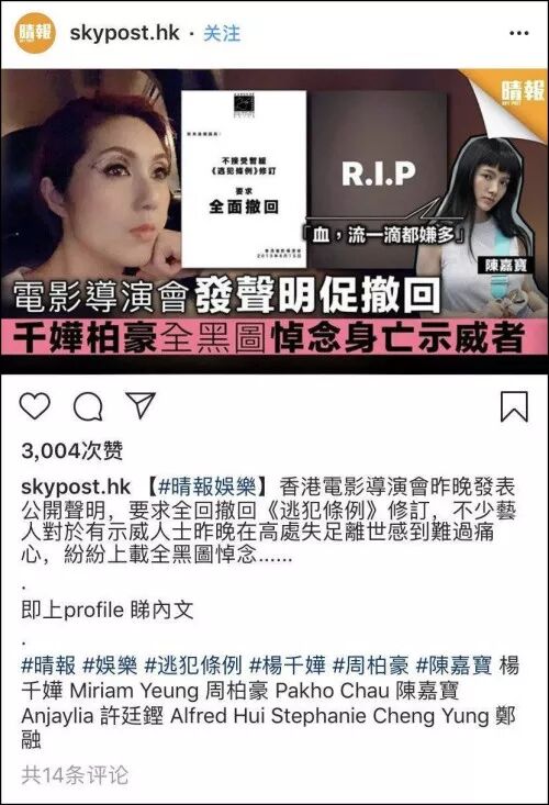 因为彼时,据称有一位示威者不满特区政府的态度,跳楼身亡了,所以不少的香港艺人都发布了全黑的图片以示哀悼。包括香港电影导演协会也发声明,要求特区政府撤回《逃犯条例》的修订。