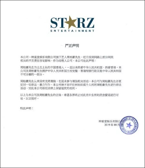 周柏豪从来没有支持“港独”,也从未参与“港独”相关活动,本公司与周柏豪更是反对一切非法、暴力行为。本公司绝不容许任何组织或个人利用周柏豪进行非法活动,对此本公司将在法律上保留追究的权利。