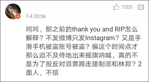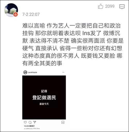 当时有不少周柏豪的粉丝也站出来维护偶像,称我们的一些网友过于神经敏感,既然《基本法》里的规定也希望香港民众可以登记做选民,积极行使自己的政治权利,何必要上纲上线呢。