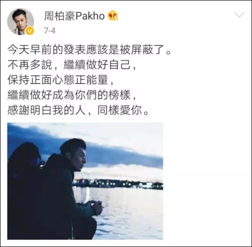 这则微博很快就遭到了站方的屏蔽,随后周柏豪又二次发布微博表示: