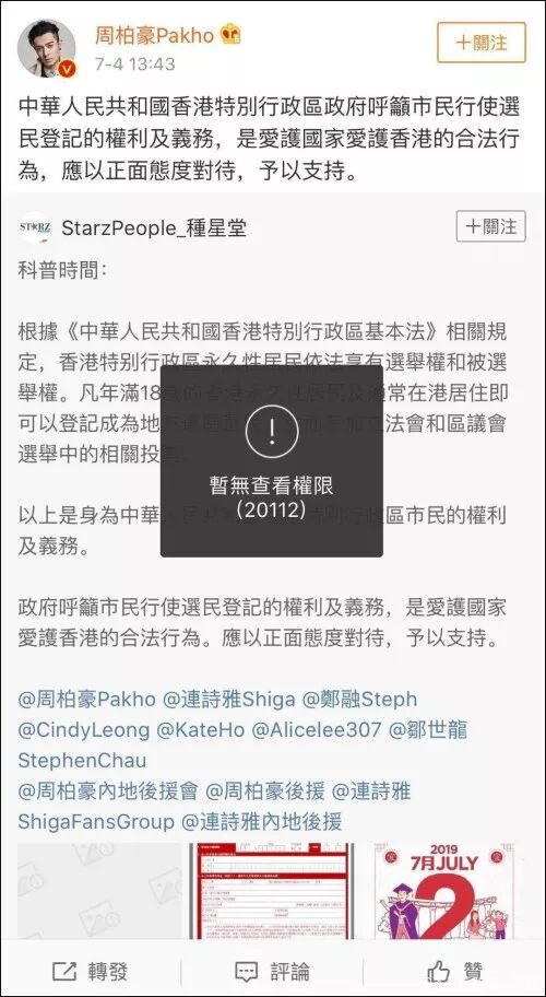 当时他也是转发了自己经纪公司对于《基本法》相关规定的科普,称:“中华人民共和国香港特别行政区政府呼吁市民行使选民登记的权利及义务,是爱护国家爱护香港的合法行为,应以正面态度对待,予以支持。”