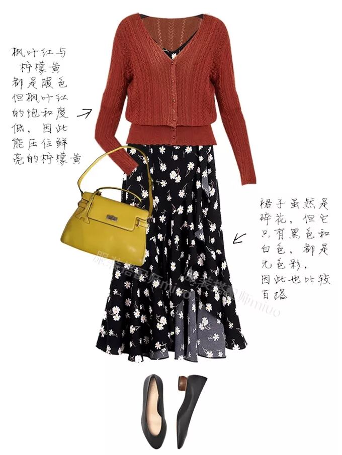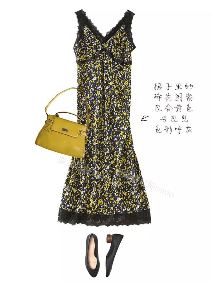 有些单品的印花图案中,也包含黄色,搭这个黄色包包就可以与之色彩呼应。如下图: