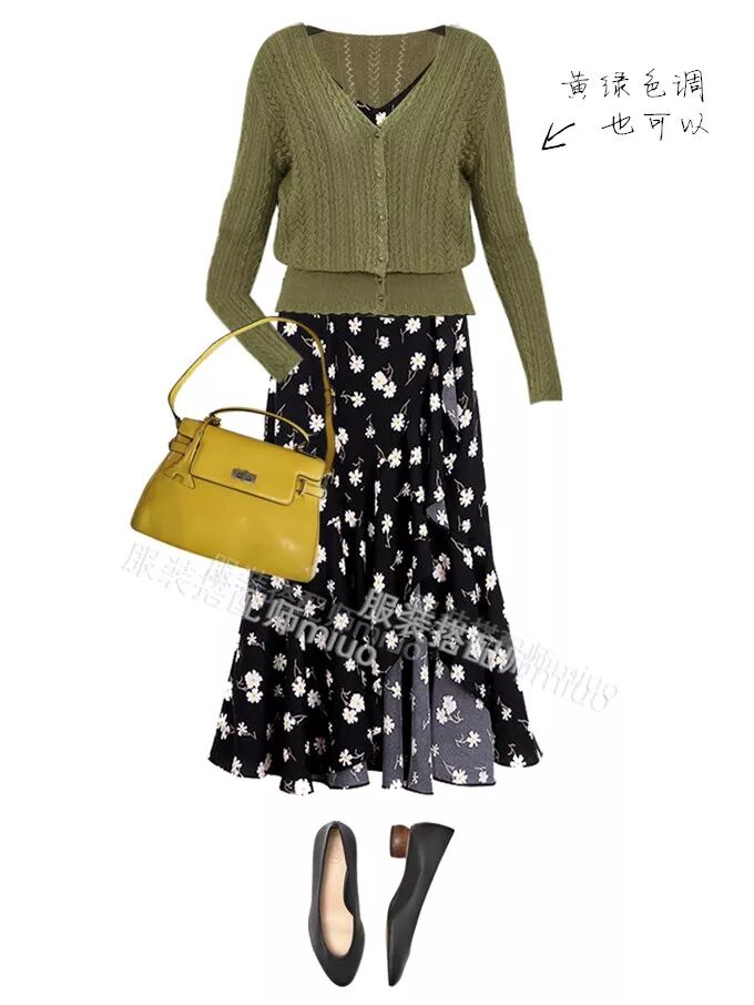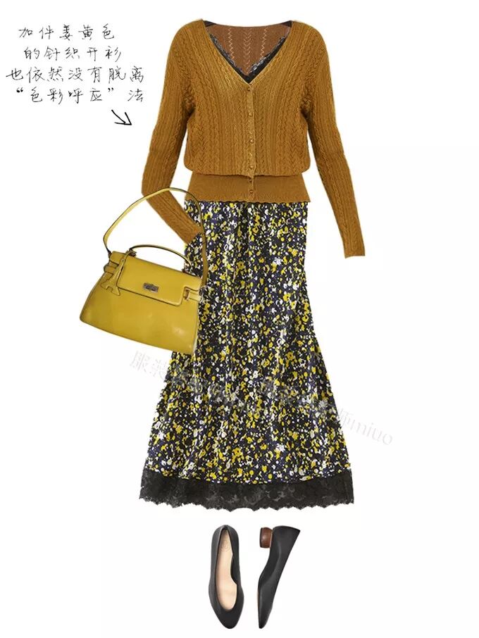 等到天凉了,在碎花真丝背心裙外,加件姜黄色的针织开衫,搭配依然和谐。