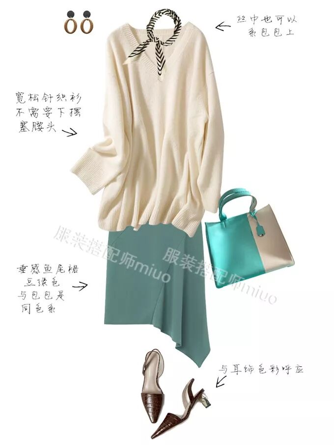 这个tiffany包是蓝绿色+象牙白的拼色,灰绿色的鱼尾裙与蓝绿色色彩呼应,奶白色的V领毛衣与象牙色呼应(色彩呼应不一定非要一模一样的颜色,相似色、同色系都可以呼应)。