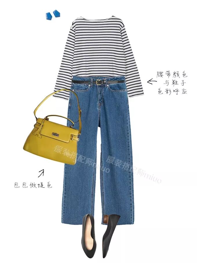 比如还是刚才的基础款条纹T+基础款牛仔阔腿裤,和这个包也能搭。柠檬黄与中蓝色的牛仔裤形成“水彩色调”,很适合春夏。