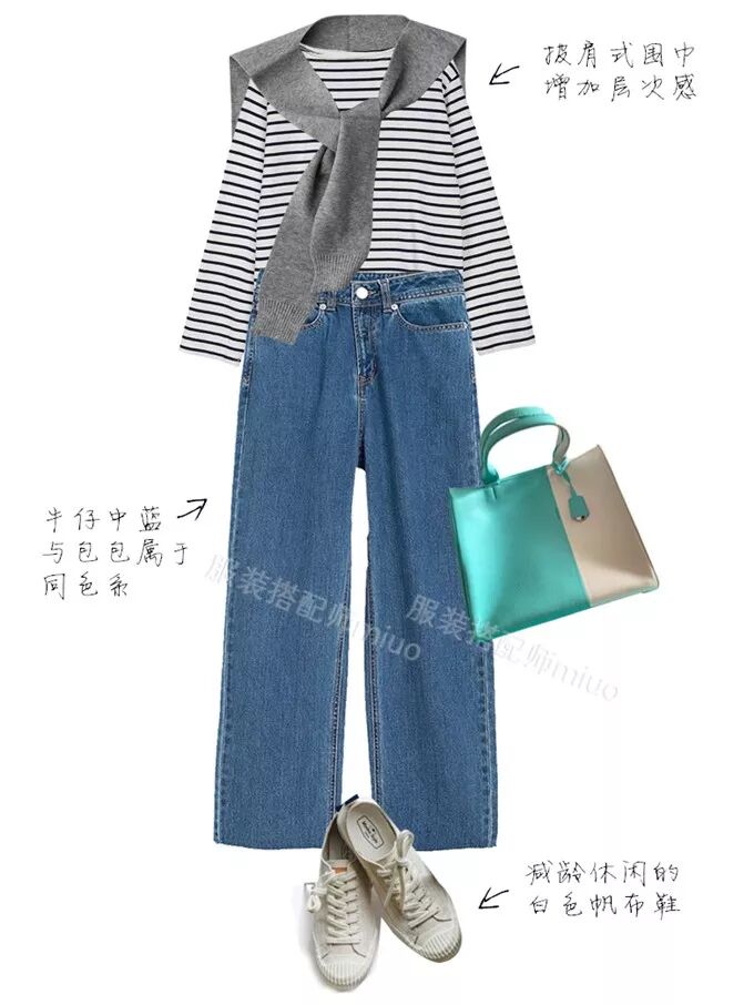 基础款条纹T+基础款牛仔阔腿裤,就可以和这个tiffany包包相配。