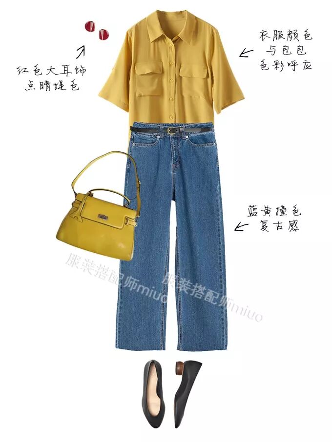依然可以采用老生常谈的“色彩呼应”,同样的牛仔裤和鞋子,换件黄色的上衣(饱和度不要太高,最好是姜黄色这类),就能与包包色彩呼应,同时还与牛仔裤形成低饱和度的撞色,会有“复古滤镜”的色调感。