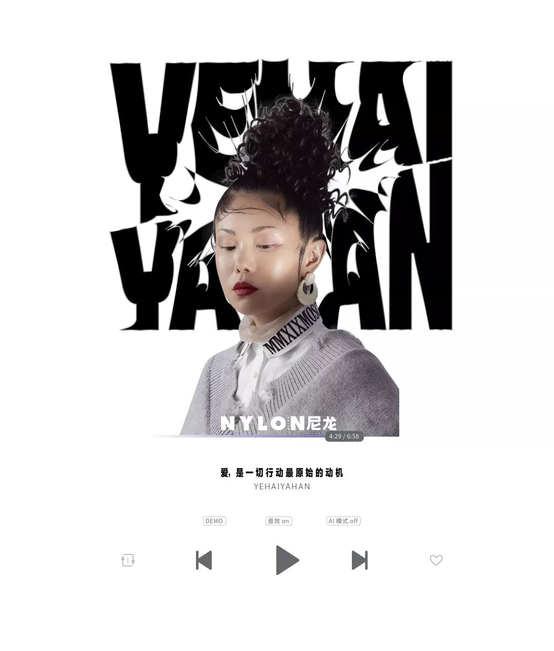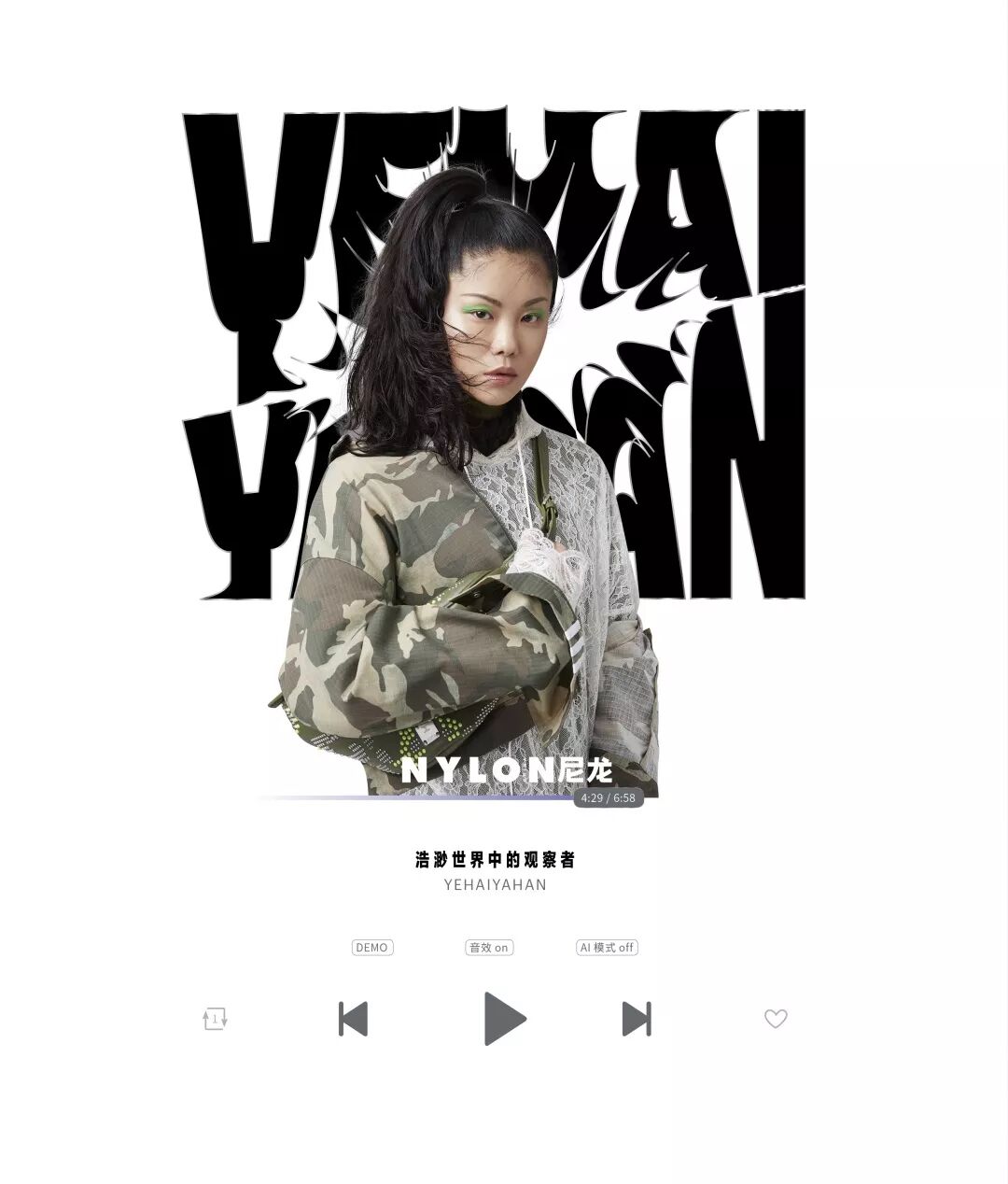 - 从昵称到真实名字,好比一种回归。YEHAIYAHAN 说:“这段时间里自己对自己的根源更感兴趣了,我似乎从这里明白了属于我的角色是什么。” 由此,诞生了改变的念头;而音乐,就是最好的表达。所以,选择了