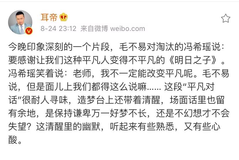 早在第一期,华晨宇就认可了冯希瑶的专业度,不过在总决赛的时候,他的表达更加直接,他说冯希瑶是一个极具天赋的好歌手。毛不易和冯希瑶的这段对话也让鹅妹和很多网友感慨,毛不易说:“其实我和希瑶一样都是被《明日之子》改变了人生轨迹的平凡人”,不过说到此,希瑶插了一句:“老师,我还不一定能改变呢”,毛不易冷不丁接了句:“我们面儿上都得这么说……”